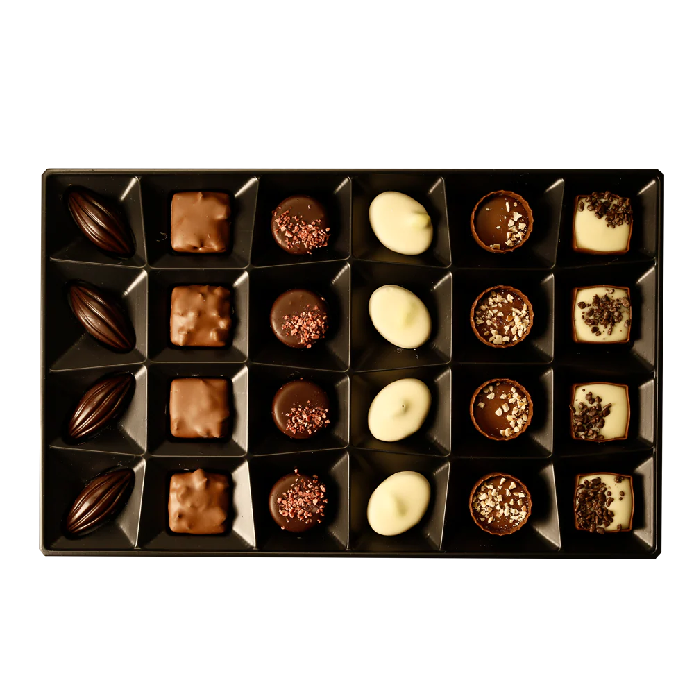 Linda caixa presenteável com 24 bombons nos sabores: brownie, morango, pistache, avelã, cacau 55%, e tiramisù. Sofisticação e sabor para impressionar quem você ama! Esta caixa é um festival de gostos e texturas, com bombons ao leite, intenso e recheios cremosos.